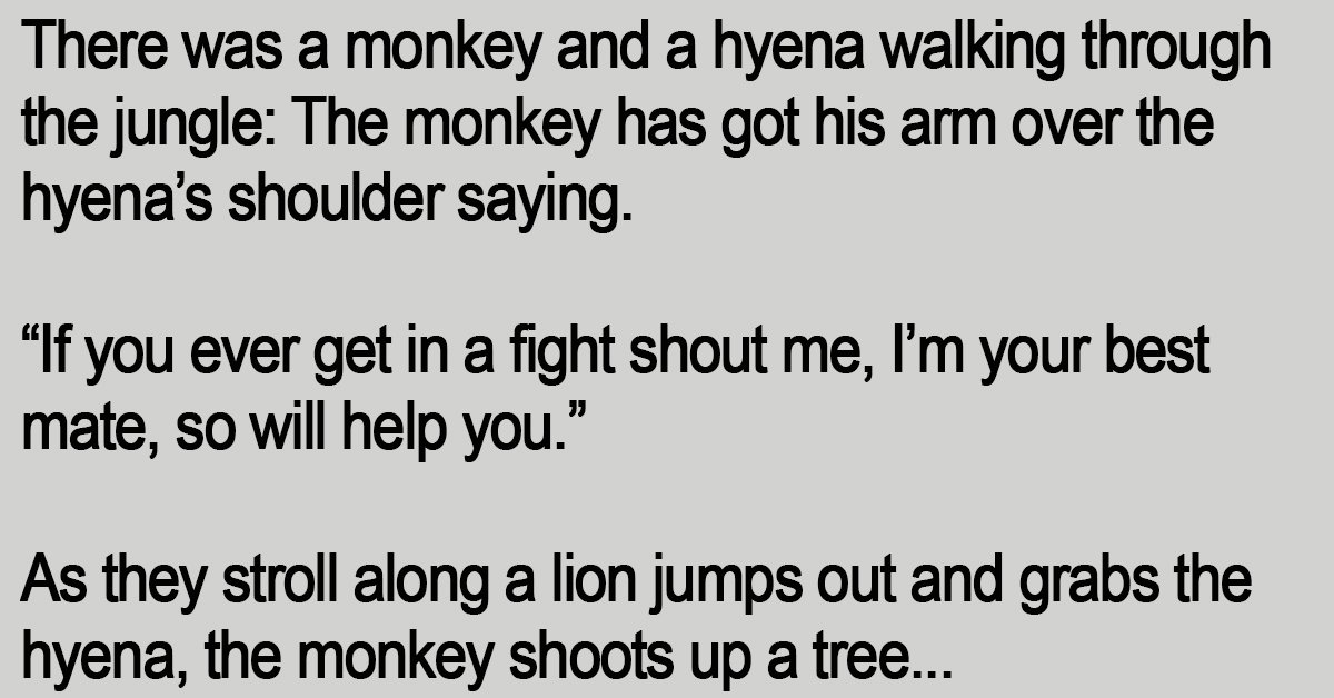 As they stroll along a lion jumps out and grabs the hyena, the monkey shoots up a tree