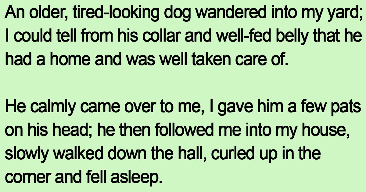 An older, tired-looking dog wandered into my yard; I could tell from his collar and well-fed belly that he had a home and was well taken care of.