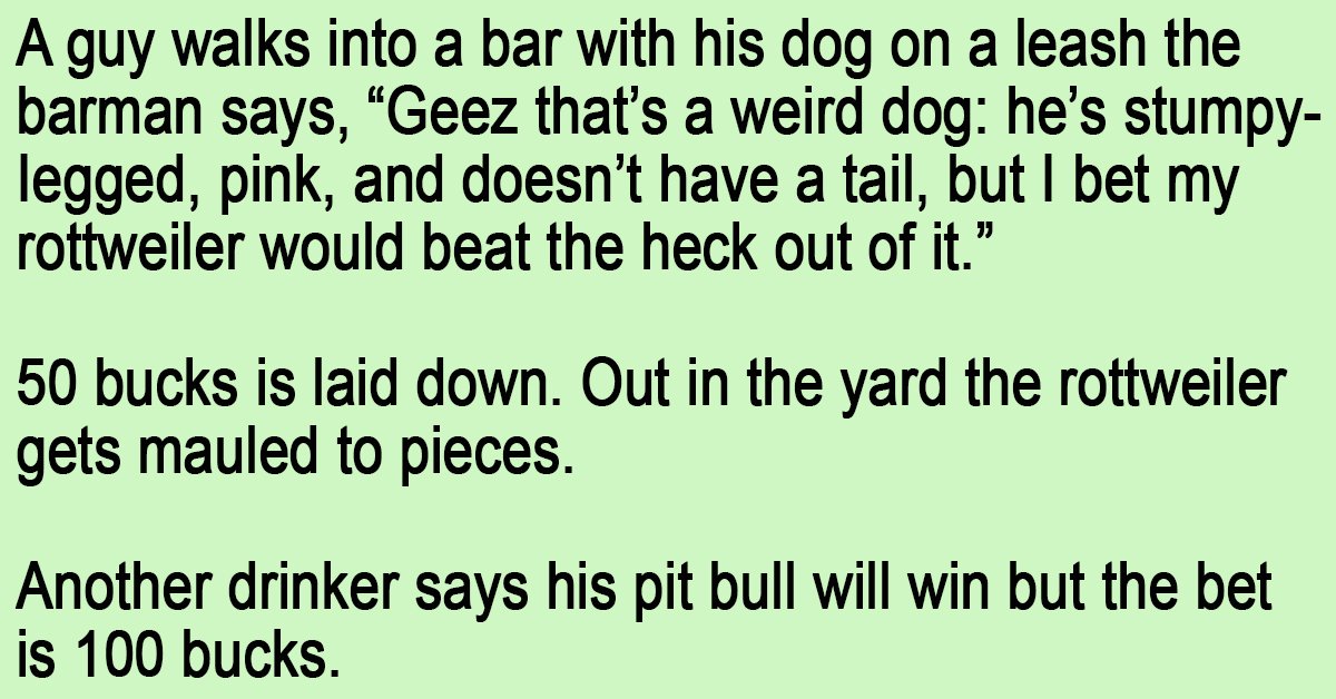 A guy walks into a bar with his dog on a leash the barman says, “Geez that’s a weird dog: he’s stumpy-Iegged, pink, and doesn’t have a tail, but I bet my rottweiler would beat the heck out of it.”