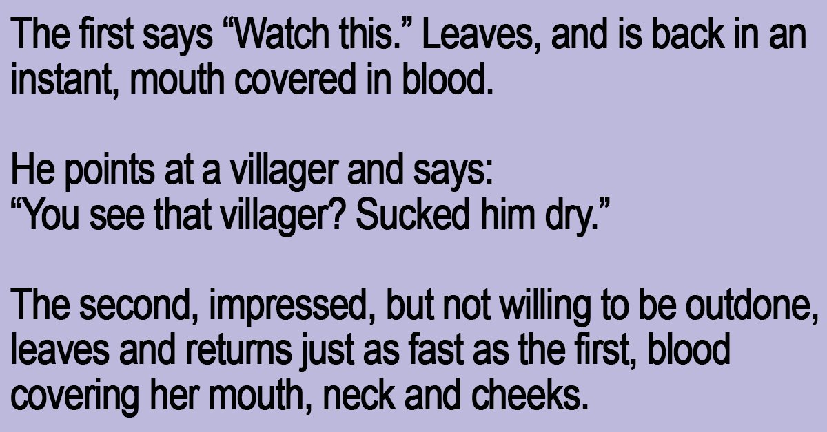 The second, impressed, but not willing to be outdone, leaves and returns just as fast as the first, blood covering her mouth, neck and cheeks.