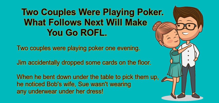 When he bent down under the table to pick them up, he noticed Bob’s wife, Sue wasn’t wearing any underwear under her dress!