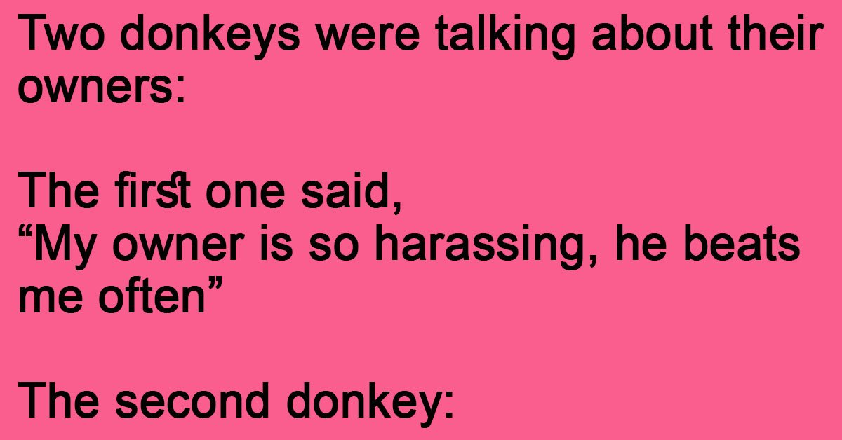 Two Donkeys Were Talking About Their Owners. April 15, 2024 by Kevin Adams Facebook Twitter Pinterest LinkedInTwo donkeys were talking about their owners: The first one said “My owner is so harassing, he beats me often” The second donkey: “Why don’t you leave your owner?” First donkey: “I was thinking about it, but he has a very good-looking daughter, and whenever she does something mischievous, he says that he would get her married to some donkey, and I am just waiting for that to happen.” Facebook Twitter Pinterest LinkedIn