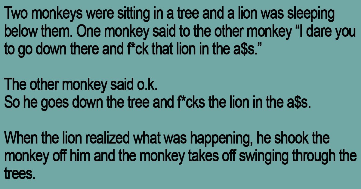 One monkey said to the other monkey “I dare you to go down there and f*ck that lion in the a$s.”