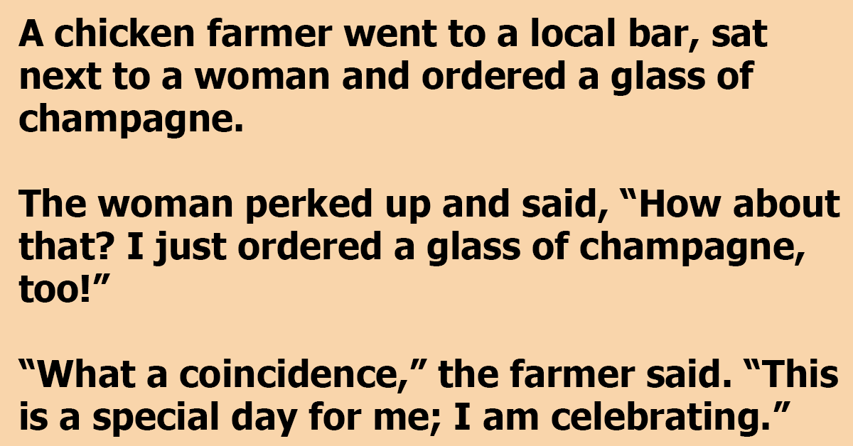 A chicken farmer went to a local bar, sat next to a woman and ordered a glass of champagne.