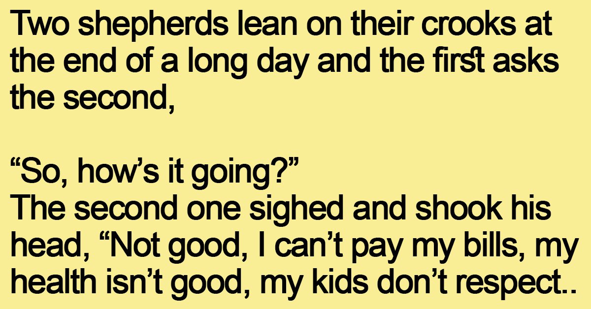 Two shepherds lean on their crooks at the end of a long day and the first asks the second,