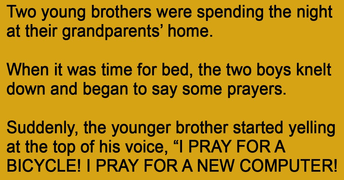 “I PRAY FOR A BICYCLE! I PRAY FOR A NEW COMPUTER! I PRAY FOR A TRIP TO DISNEYLAND!” and so on…