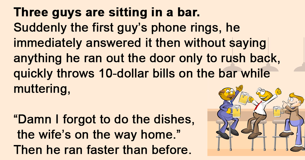 Three guys are sitting in a bar. Suddenly the first guy’s phone rings, he immediately answered it then without saying anything he ran out the door only to rush back, quickly throws 10-dollar bills on the bar while muttering, “Damn I forgot to do the dishes, the wife’s on the way home.” Then he ran faster than before.