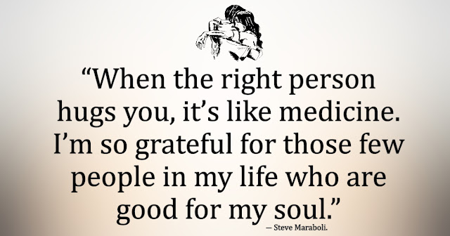 When the right person hugs you, it’s like medicine. I’m so grateful for those few people in my life who are good for my soul.” ― Steve Maraboli.