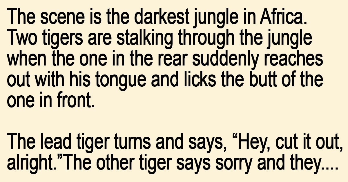 Two tigers are stalking through the jungle when the one in the rear suddenly reaches out with his tongue and licks the butt of the one in front.