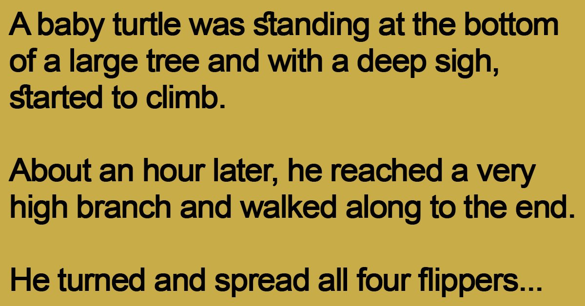 A baby turtle was standing at the bottom of a large tree and with a deep sigh, started to climb.