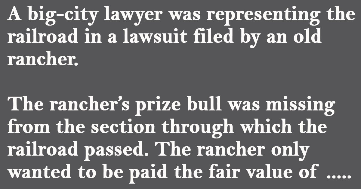 A big-city lawyer was representing the railroad in a lawsuit filed by an old rancher.
