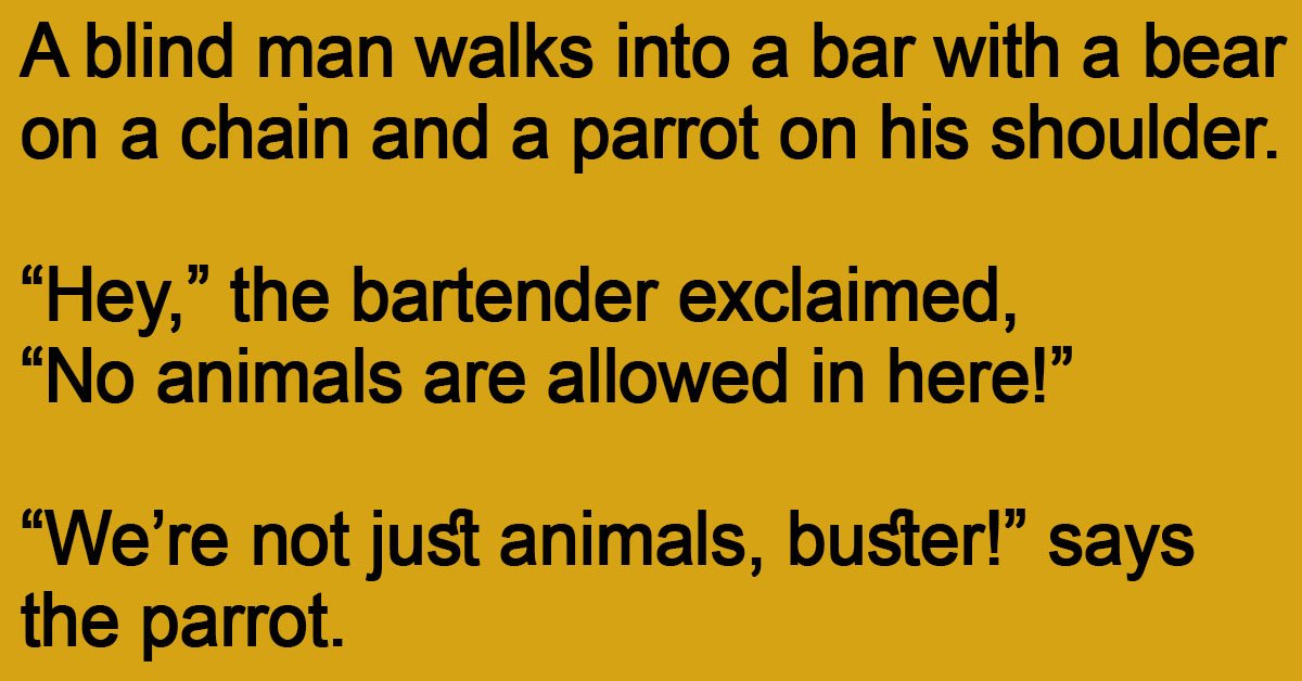 A blind man walks into a bar with a bear on a chain and a parrot on his shoulder.