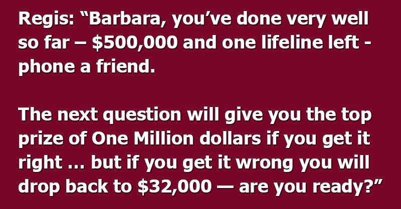 Regis: “Barbara, you’ve done very well so far – $500,000 and one lifeline left — phone a friend.