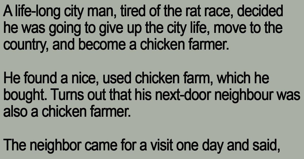 A life-long city man, tired of the rat race, decided he was going to give up the city life, move to the country, and become a chicken farmer.