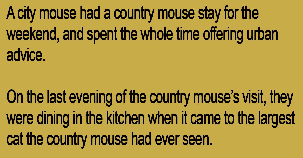 On the last evening of the country mouse’s visit, they were dining in the kitchen when it came to the largest cat the country mouse had ever seen.