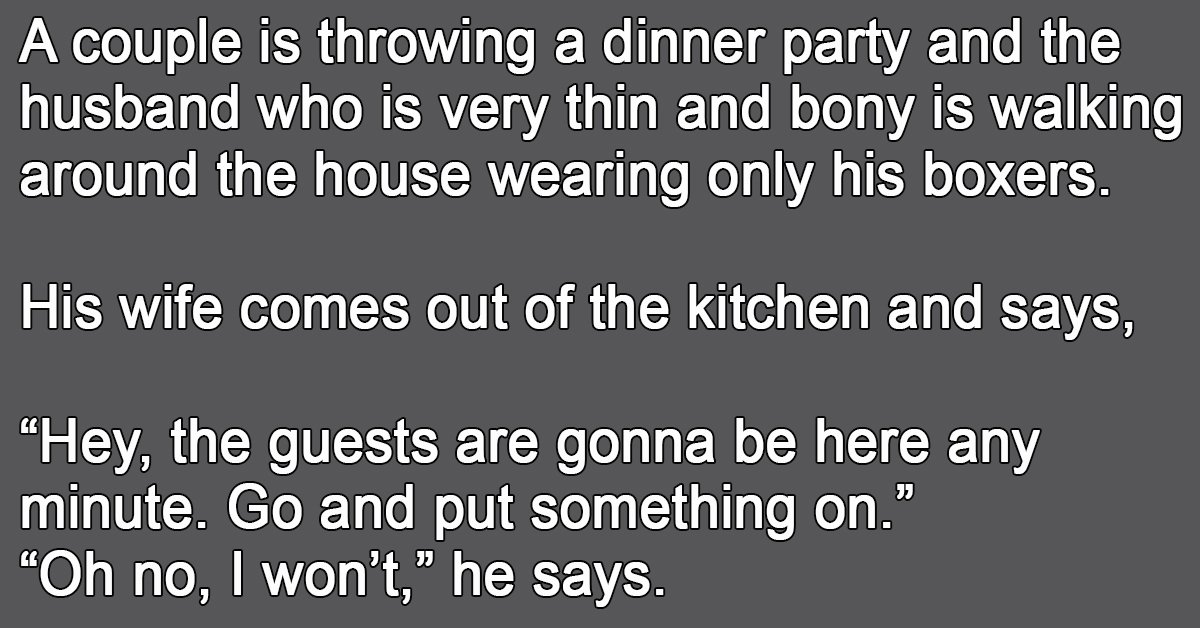A couple is throwing a dinner party and the husband who is very thin and bony is walking around the house wearing only his boxers.