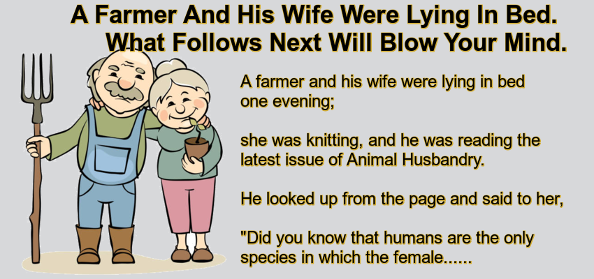 A Farmer And His Wife Were Lying In Bed. – May 5, 2022 by Kevin Adams Facebook Twitter Pinterest LinkedIn A farmer and his wife were lying in bed one evening; she was knitting, and he was reading the latest issue of Animal Husbandry. He looked up from the page and said to her, “Did you know that humans are the only species in which the female achieves [email protected]?” She looked at him wistfully, smiled, and replied, “Oh, yeah? Prove it.” He frowned for a moment, then said, “Okay.” He got up and walked out, leaving his wife with a confused look on her face. About a half-hour later, he returned all tired and sweaty and proclaimed, “Well, I’m sure the cow and sheep didn’t, but the way that pig is always squealing, how can I tell?” Facebook Twitter Pinterest LinkedIn