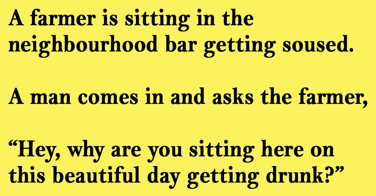 Farmer: Well I didn’t have any more rope, so I took off my belt and tied her tail to the rafter. At that moment, my pants fell down and my wife walked in.
