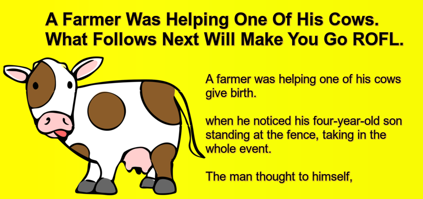 A Farmer Was Helping One Of His Cows. – May 23, 2022 by Kevin Adams Facebook Twitter Pinterest LinkedIn A farmer was helping one of his cows give birth when he noticed his four-year-old son standing at the fence, taking in the whole event. The man thought to himself, “Great. He’s four and I’m gonna have to start explaining the birds and the bees. No need to jump the gun – I’ll just let him ask, and I’ll answer.” After everything was over, the man walked over to his son and said, “Well son, do you have any questions?” “Just one,” gasped the still wide-eyed boy. “Just how fast was that calf going when he hit that cow?” Facebook Twitter Pinterest LinkedIn