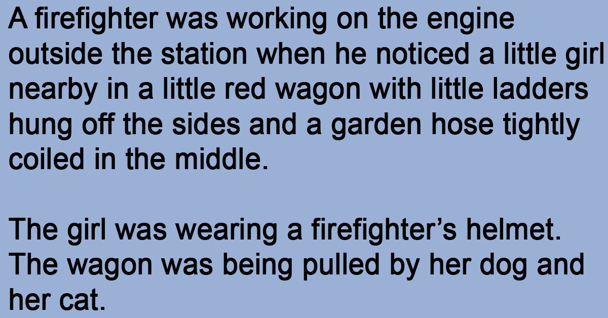 A firefighter was working on the engine outside the station when he noticed a little girl nearby in a little red wagon with little ladders hung off the sides and a garden hose tightly coiled in the middle.