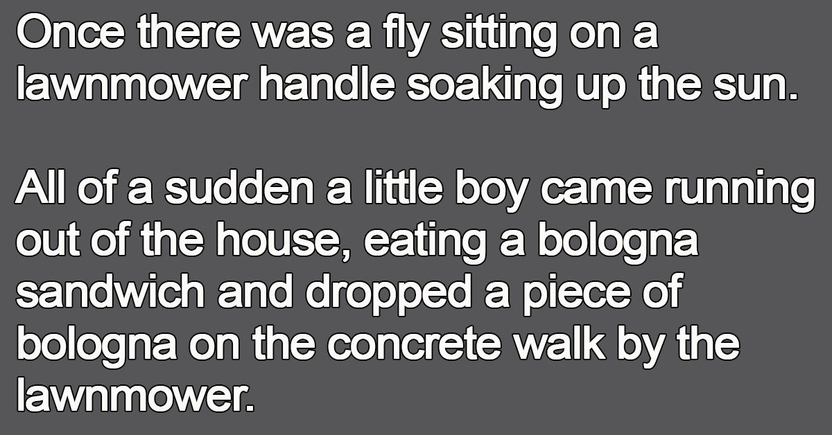 Once there was a fly sitting on a lawnmower handle soaking up the sun.
