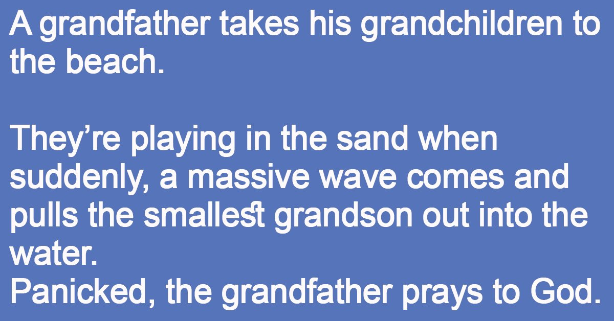 They’re playing in the sand when suddenly, a massive wave comes and pulls the smallest grandson out into the water.