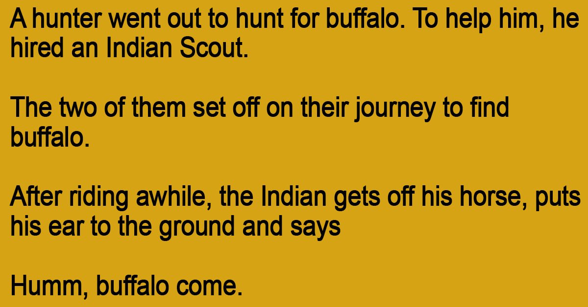 After riding awhile, the Indian gets off his horse, puts his ear to the ground and says