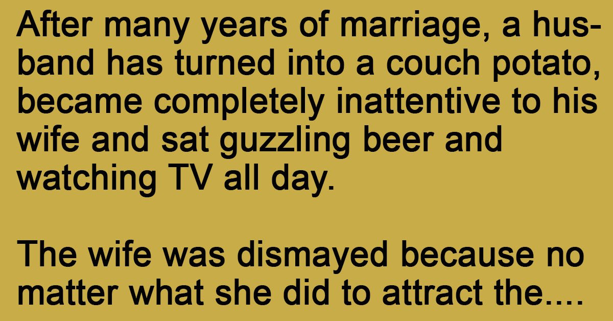 After many years of marriage, a husband has turned into a couch potato, became completely inattentive to his wife and sat guzzling beer and watching TV all day.