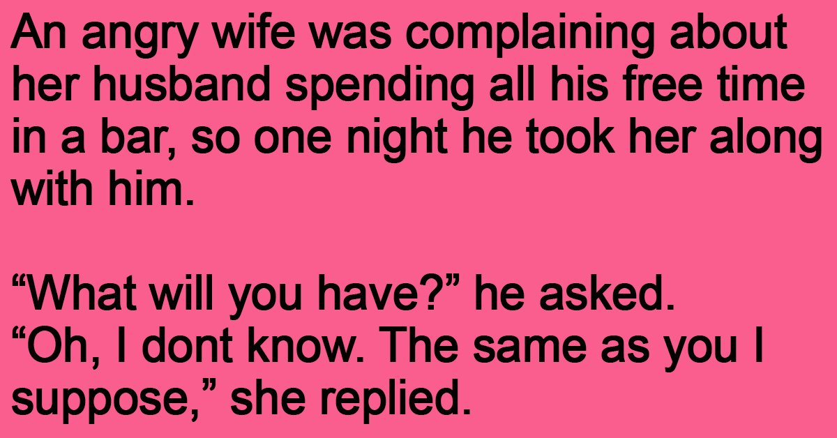 An angry wife was complaining about her husband spending all his free time in a bar, so one night he took her along with him.