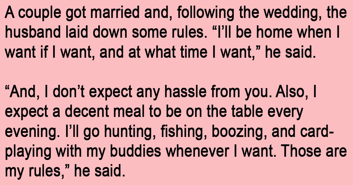 “And, I don’t expect any hassle from you. Also, I expect a decent meal to be on the table every evening. I’ll go hunting, fishing, boozing, and card-playing with my buddies whenever I want. Those are my rules,” he said.
