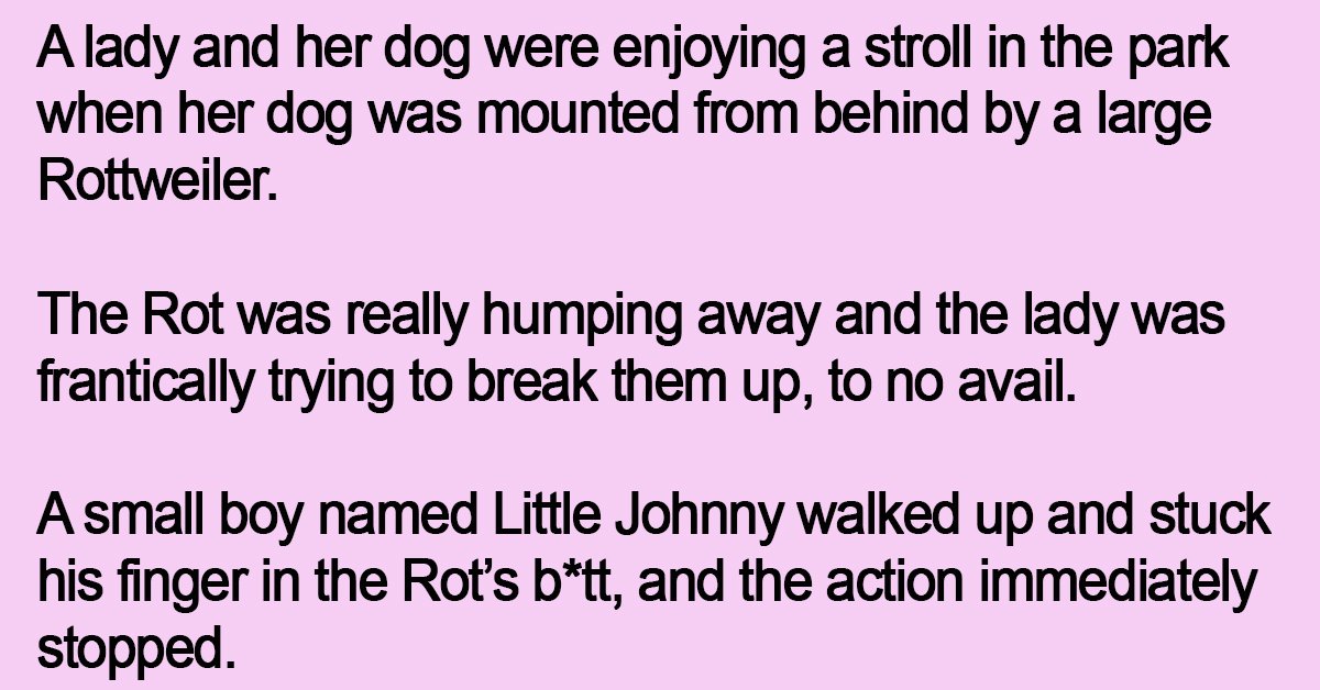 A lady and her dog were enjoying a stroll in the park when her dog was mounted from behind by a large Rottweiler.