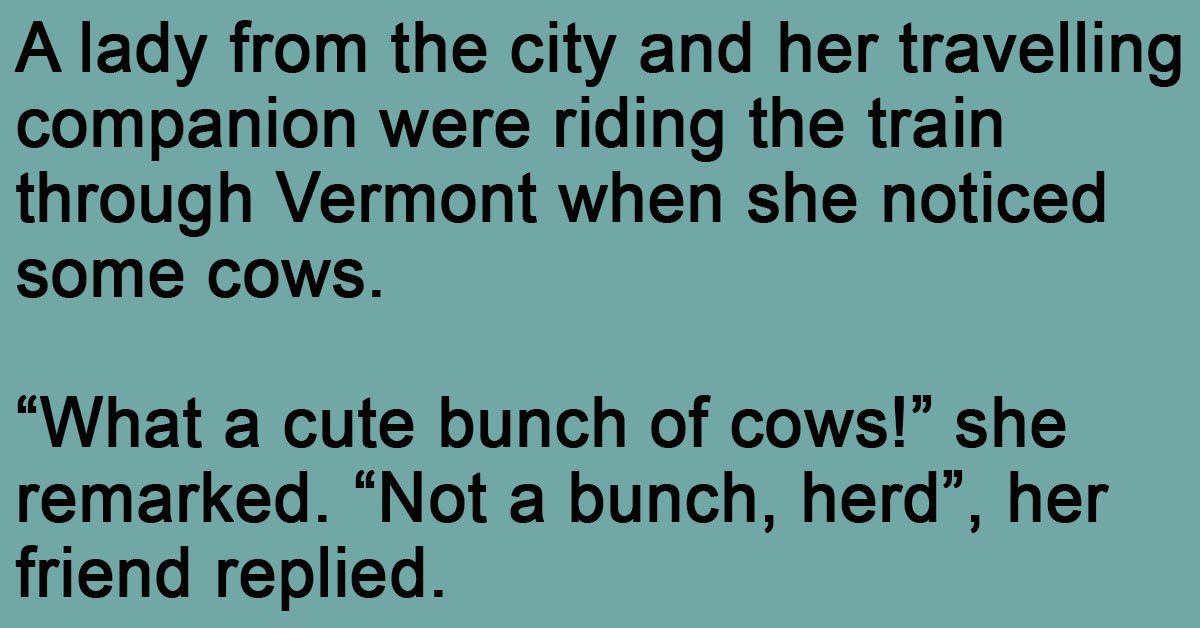 A lady from the city and her travelling companion were riding the train through Vermont when she noticed some cows.