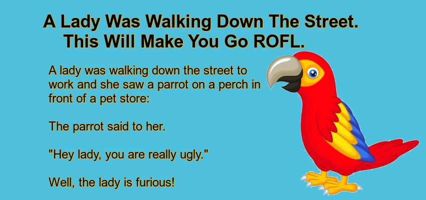 A Lady Was Walking Down The Street. – May 22, 2022 by Kevin Adams Facebook Twitter Pinterest LinkedIn A lady was walking down the street to work and she saw a parrot on a perch in front of a pet store: The parrot said to her. “Hey lady, you are really ugly.” Well, the lady is furious! She stormed past the store to her work. On the way home, she saw the same parrot and it said to her. “Hey lady, you are really ugly.” She was incredibly ticked now. The next day the same parrot again said to her. “Hey lady, you are really ugly.” The lady was so ticked that she went into the store and said that she would sue the store and kill the bird. The store manager replied. “That’s not good.” And promised he wouldn’t say it again. When the lady walked past the store that day after work the parrot called to her. “Hey lady.” She paused and said. “Yes?” The bird said. “You know.” Facebook Twitter Pinterest LinkedIn