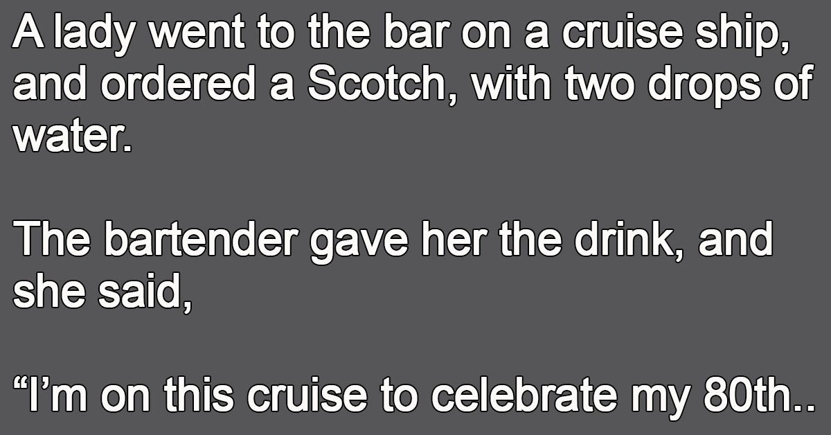The lady said, “Thank you very much, my dear. Bartender, I’ll have another Scotch, with two drops of water.”