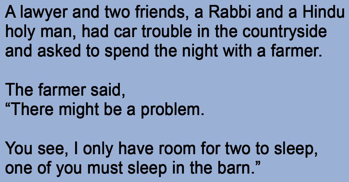 A lawyer and two friends, a Rabbi and a Hindu holy man, had car trouble in the countryside and asked to spend the night with a farmer.