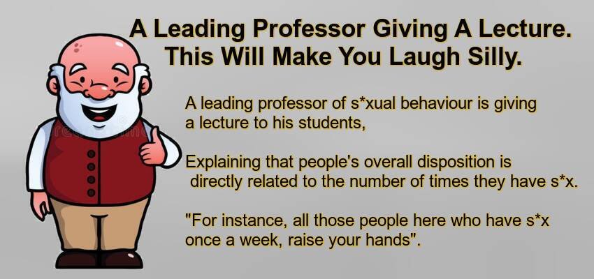 A Leading Professor Giving A Lecture. – May 20, 2022 by Kevin Adams Facebook Twitter Pinterest LinkedIn A leading professor of s*xual behaviour is giving a lecture to his students, Explaining that people’s overall disposition is directly related to the number of times they have s*x. “For instance, all those people here who have s*x once a week, raise your hands”. Quite a few of the men with beaming faces raise their hands. “Now all those people who have s*x once a month raise your hands”. A few of the more glum men hold up their hands. “Now the people who have s*x only once a year raise your hands” One or two really miserable buggers raise their hands sheepishly. “Now anyone who only has s*x once every ten years raise their hands” An old man in the back row with a beaming face and a grin from ear to ear jumps out of his seat and gleefully shouts ” Me me me”!!!!!! The professor is astounded by the old man’s joyful look, “You only have s*x once every ten years”? he inquires “Yes indeed,” says the old man barely containing his glee, “Well, why do you look so happy”? “It’s TONIGHT, ITS TONIGHT” replies the old man. Facebook Twitter Pinterest LinkedIn