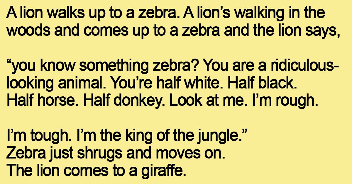 “you know something zebra? You are a ridiculous-looking animal. You’re half white. Half black. Half horse. Half donkey. Look at me. I’m rough. I’m tough. I’m the king of the jungle.”