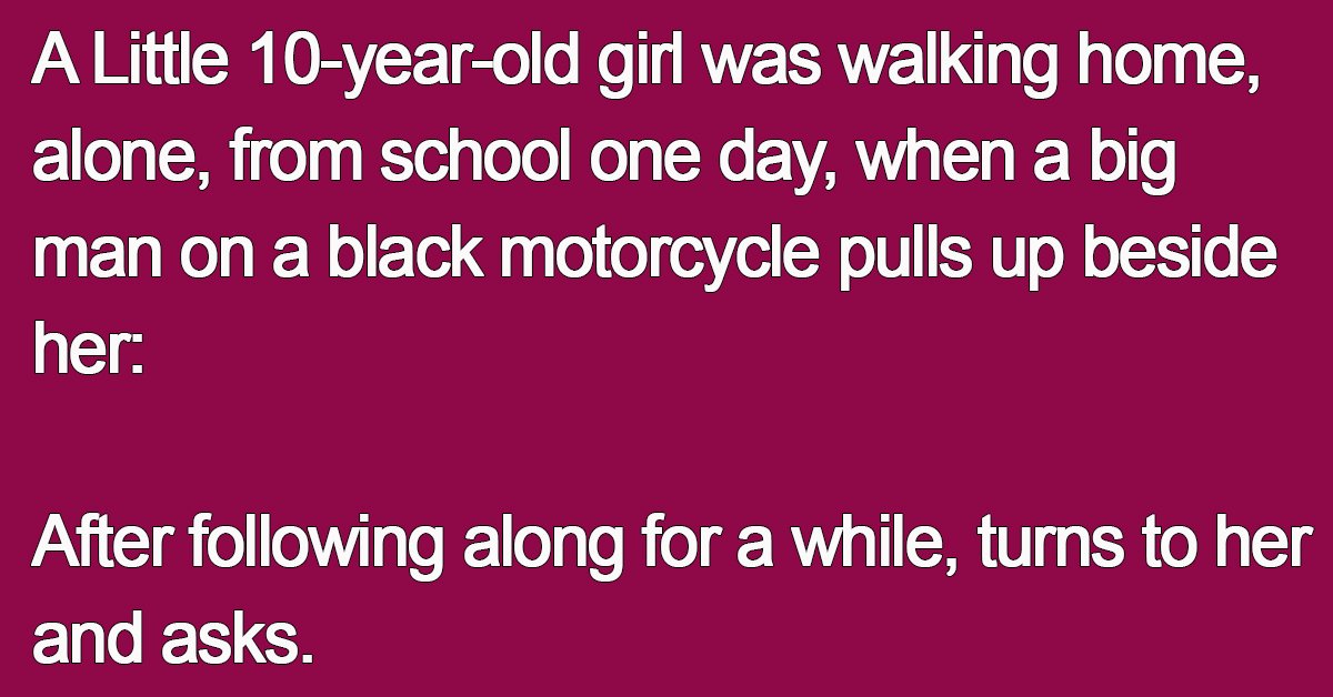 A Little 10-year-old girl was walking home, alone, from school one day, when a big man on a black motorcycle pulls up beside her:
