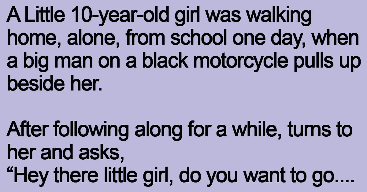 A Little 10-year-old girl was walking home, alone, from school one day, when a big man on a black motorcycle pulls up beside her.