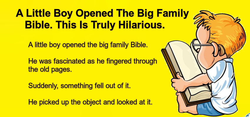 A Little Boy Opened The Big Family Bible. – April 4, 2022 by Kevin Adams Facebook Twitter Pinterest LinkedIn A little boy opened the big family Bible. He was fascinated as he fingered through the old pages. Suddenly, something fell out of it. He picked up the object and looked at it. It was an old leaf that had been pressed in between the pages. “Mama, look what I found!” the boy called out. “What have you got there, dear?” In an astonished voice, he answered: “I think it’s Adam’s underwear!” Facebook Twitter Pinterest LinkedIn