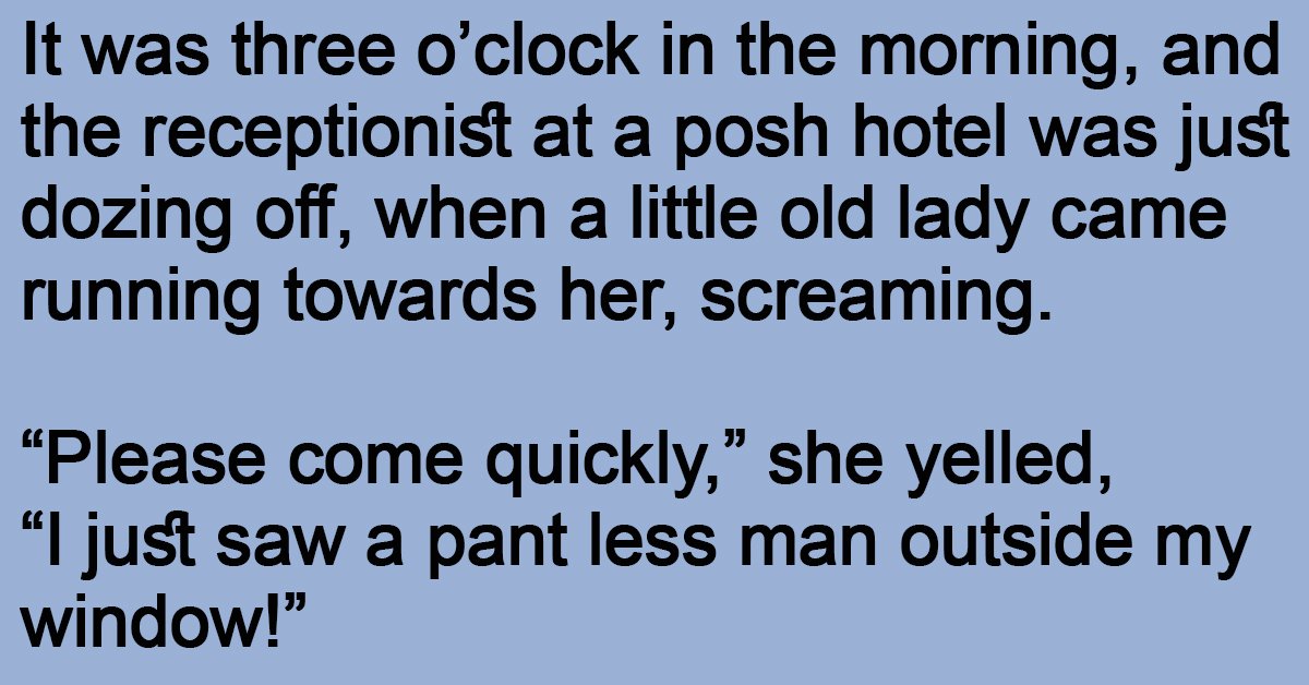 It was three o’clock in the morning, and the receptionist at a posh hotel was just dozing off, when a little old lady came running towards her, screaming.