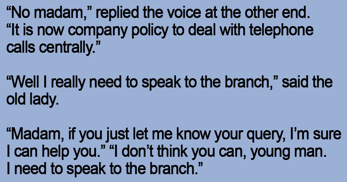 A little old lady tried to phone her local bank but was put through instead to the bank’s call centre.