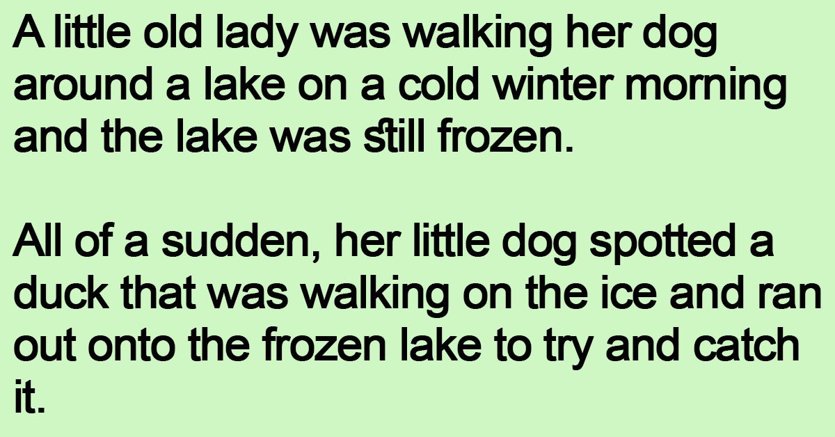 A little old lady was walking her dog around a lake on a cold winter morning and the lake was still frozen.