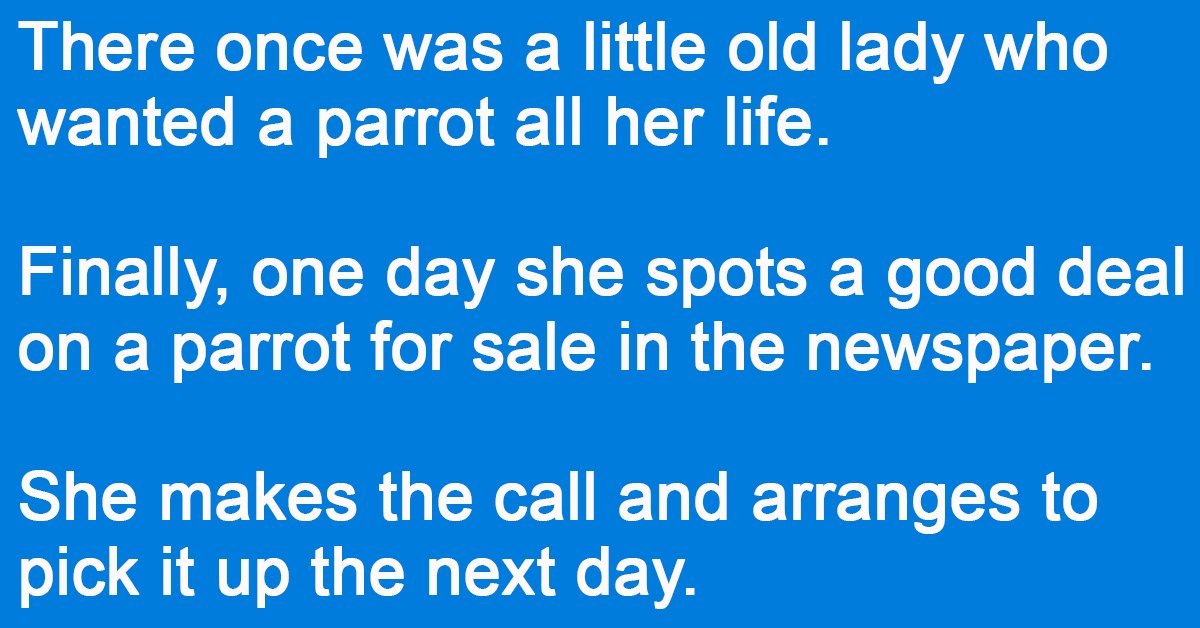 Well!!! The little old lady’s hair stood straight up! She opens the cage door, grabs the Parrot and shakes her finger at him.