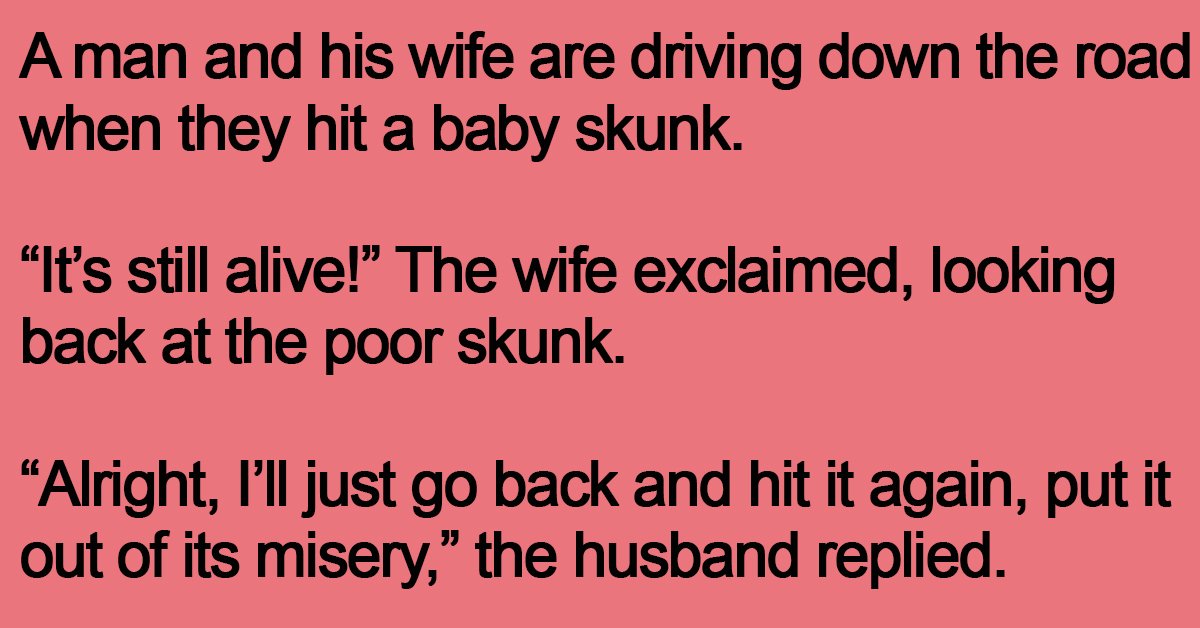 “It’s still alive!” The wife exclaimed, looking back at the poor skunk.