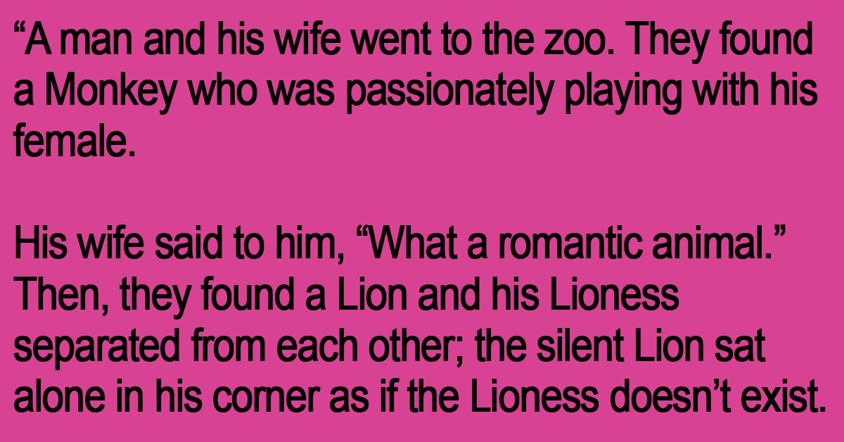 Then, they found a Lion and his Lioness separated from each other; the silent Lion sat alone in his corner as if the Lioness doesn’t exist. His wife said to him,