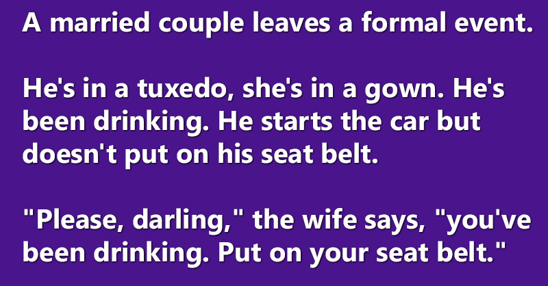 “Please, darling,” the wife says, “you’ve been drinking. Put on your seat belt.”