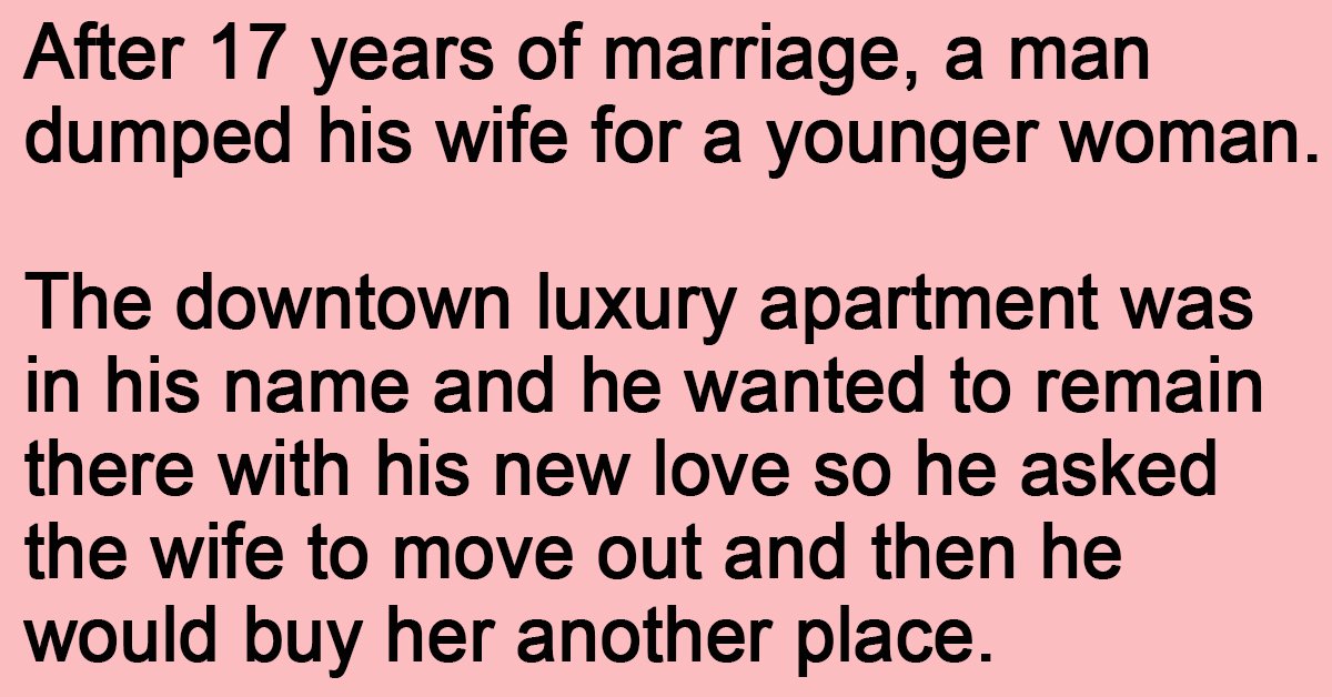 The downtown luxury apartment was in his name and he wanted to remain there with his new love so he asked the wife to move out and then he would buy her another place.