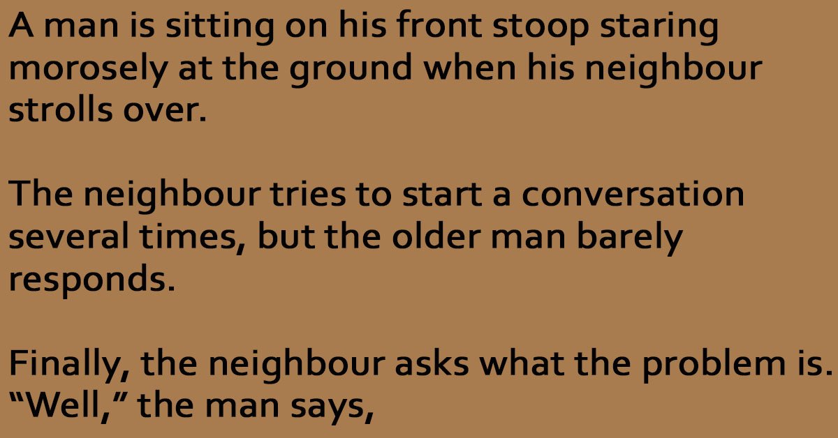 A man is sitting on his front stoop staring morosely at the ground when his neighbour strolls over.