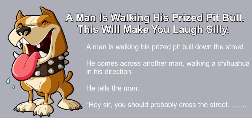 A Man Is Walking His Prized Pit Bull. – May 2, 2022 by Kevin Adams Facebook Twitter Pinterest LinkedIn A man is walking his prized pit bull down the street. He comes across another man, walking a chihuahua in his direction. He tells the man: “Hey sir, you should probably cross the street. My pitbull was trained to fight and will rip your tiny dog to shreds!” To which the man with the chihuahua replies: “Oh no, sir, it is you who should cross the street; I wouldn’t want your beautiful pitbull to get hurt.” The pitbull owner laughs and says: “Want to bet? Let’s let them off their leashes and see what happens.” Chihuahua owner shrugs and says okay. Both dog owners release the leashes, and the chihuahua proceeds to destroy and devour the pitbull. The pit bull owner, in absolute disbelief, says: “Holy crap! I can’t believe it! I will buy your dog from you right now, how much do you want for him?” The chihuahua owner thinks for a moment, and replies: “20 thousand and he’s yours.” “20 thousand?! Why so much?!” “Well…. it was 10 thousand for the crocodile and 10 thousand for the plastic surgery.” Facebook Twitter Pinterest LinkedIn